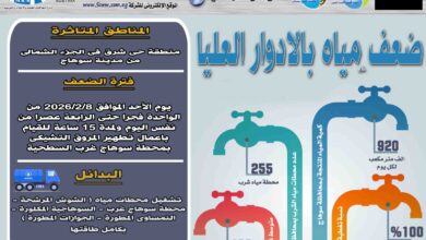 الأحد : ضعف المياه بالادوار العليا بمنطقة حى شرق بمدينة سوهاج من الواحدة فجرا ولمدة 15 ساعة للقيام باعمال تطهير المروق التشيكى بمحطة سوهاج غرب السطحية