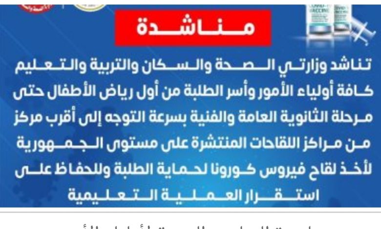 الصحه والتعليم تناشدت كافة أولياء الأمور وأسر الطلبة للحصول على اللقاح