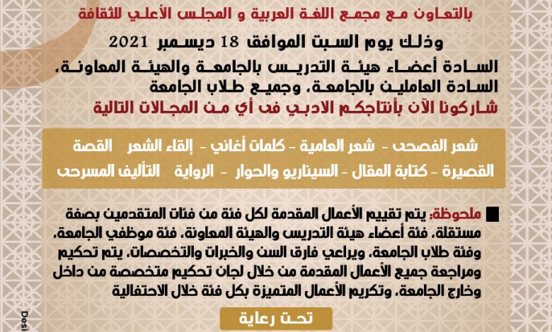 تقيم جامعة عين شمس احتفالية جامعة عين شمس باليوم العالمي للغة العربية للسادة أعضاء هيئة التدريس والهيئة المعاونة والسادة العاملين وجميع الطلاب للمشاركة بالانتاج الأدبي تحت رعاية ا. د محمود المتيني رئيس جامعة عين شمس ، ا. د عبد الفتاح سعود نائب رئيس الجامعة لشئون التعليم والطلاب،