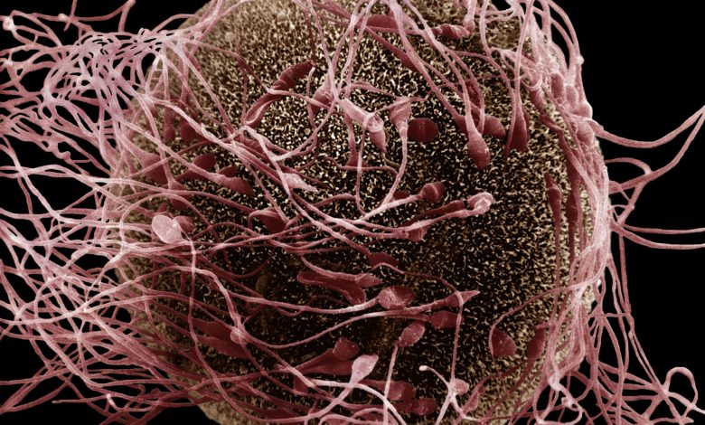 يُظهر التصوير المجهر الإلكتروني الماسح لحظة الإخصاب التي تتضمن بويضة بشرية وحيوانات منوية. من الناحية التاريخية ، غالبًا ما يتم تصوير البويضة على أنها سلبية بينما يتنافس الحيوانات المنوية في المنافسة ، لكن النتائج الجديدة تشير إلى أن البويضة قد تحجب الحيوانات المنوية بجينات غير مناسبة.