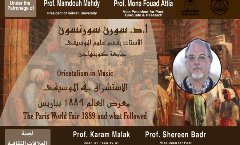 تنظم لجنة العلاقات الثقافية بكلية التربية الموسيقية جامعة حلوان ندوة بعنوان الاستشراق في الموسيقى .. معرض العالم ١٨٨٩ بباريس، وذلك تحت رعاية الاستاذ الدكتور ممدوح مهدى القائم بعمل رئيس الجامعة، الاستاذة الدكتورة منى فؤاد نائب رئيس الجامعة للدراسات العليا والبحوث، الأستاذ الدكتور كرم ملاك عميد كلية التربية الموسيقية، واشراف الاستاذة الدكتورة شيرين عبد اللطيف وكيل الكلية للدراسات العليا والبحوث.