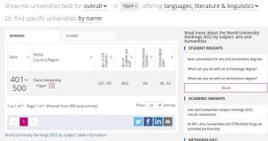 أكد التقرير الذي أعدته وحدة التصنيفات الدولية بالجامعة أن وجود جامعة القاهرة الوحيدة التى يتم تصنيفها فى قطاع الآداب والعلوم الانسانية، نجاح جديد يضاف إلى سلسلة نجاحات الجامعة بالتواجد في كافة التصنيفات العالمية المرموقة، والتصنيف يستخدم نفس مؤشرات الأداء في تصنيفات التايمز للتعليم العالي العالمية فى الموضوعات المتنوعة، ولكن تمت إعادة ضبط المنهجية لتلائم المجالات الفردية.
