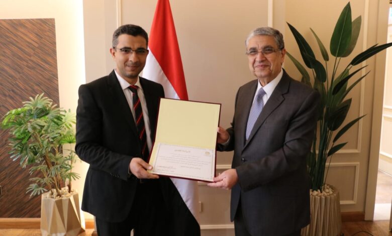 قدم الدكتور شاكر وزير الكهرباء والطاقة المتجددة شهادة تقديرية للسيد الدكتور” احمد سامى حسن على ” مهندس ثان ورئيس قسم بالمكتب الفنى لسيادته وذلك لحصوله على درجة الدكتوراه الفلسفة فى هندسة القوى الكهربية عن موضوع :