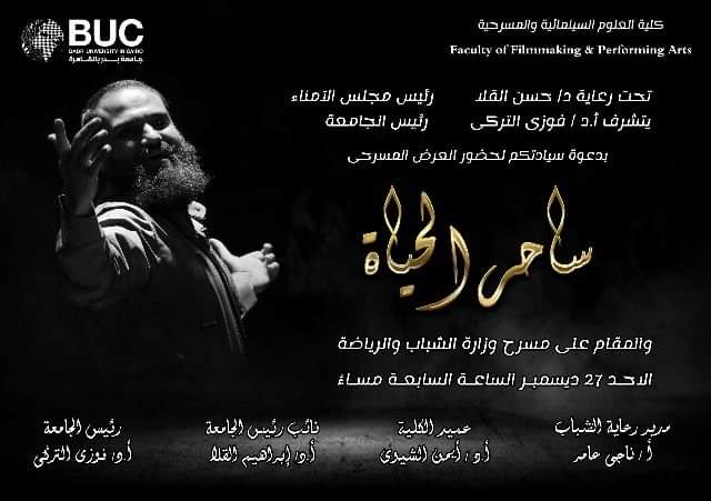 ضمن فاعليات مهرجان إبداع السينما والمسرح بجامعة بدر تدعو الجمهور مجاناً مسرحية “ساحر الحياة”..