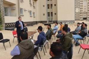 و عقب اللقاء قام الدكتور فهمي شارل بزيارة موقع عدد من شركات البناء في مدينة العلمين والإجابة على أسئلتهم الخاصة بالصحة المهنية في مواقع البناء بعد عرض مفصل عن الموضوع.