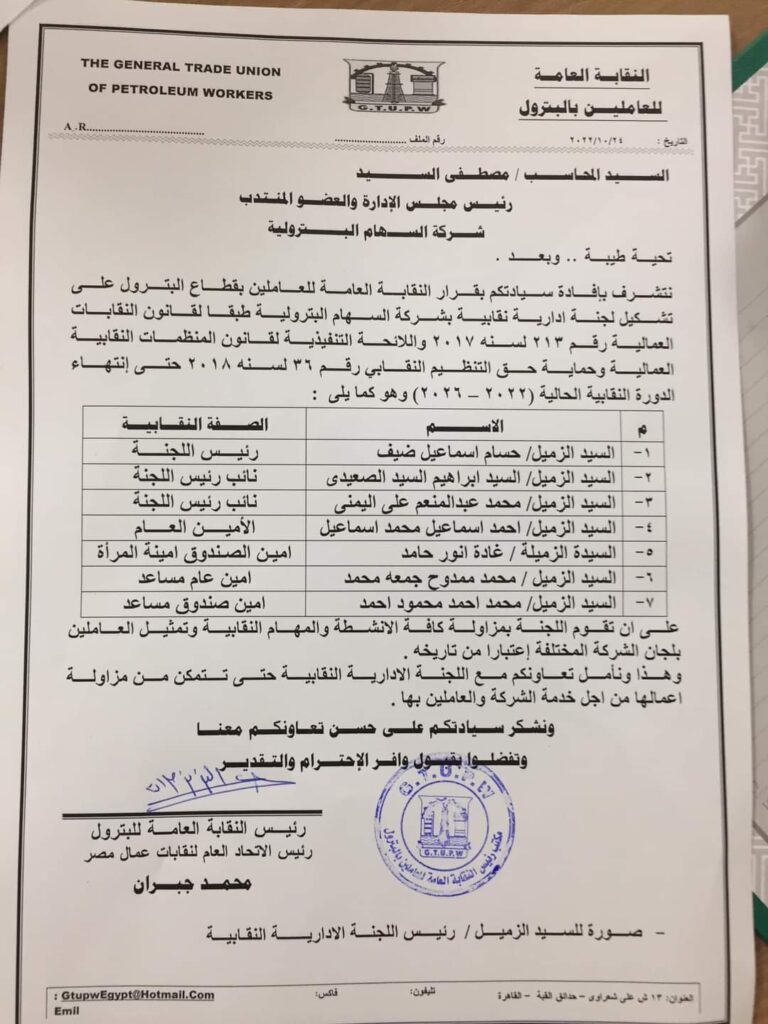 كان قد اصدرت النقابة العامة للعاملين بالبترول، برئاسة محمد جبران بتشكيل لجنـة إداريـة نقابيـة بشـركة السـهام البتروليـة طبقـا لـقـانـون النقابـات العماليـة رقـم ۲۱۳ لسـنـه ٢٠١٧ واللائحـة التنفيذيـــة لقـانون المنظمات النقابيـة العماليـة وحمايـة حـق التنظـيم النقــابي رقـم 36 لسـنـه ٢٠١٨ حتـى إنتهـ اء الدورة النقابية الحالية (٢٠٢٢ – ٢٠٢٦)