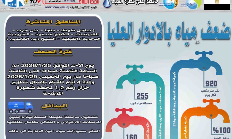 اعلنت شركة مياه الشرب والصرف الصحى بسوهاج عن ضعف المياه بالادوار العليا بقرى ساحل طهطا و بنجا و بنى حرب والقبيصات والشيخ مسعود والحريدية القبلية والبحرية والشيخ زين العابدين يوم الأحد الموافق 25 يناير 2026 فى تمام الثامنة صباحا وحتى الثامنة صباحا من يوم الخميس الموافق 29 يناير 2026 ولمدة 4 أيام صرح بذلك المهندس محمد صلاح الدين عبد الغفار رئيس مجلس الإدارة والعضو المنتدب واضاف انه يتم خلال تلك الفترة القيام باعمال تطهير خزان رقم 1, 2 لمحطة شطورة المرشحة