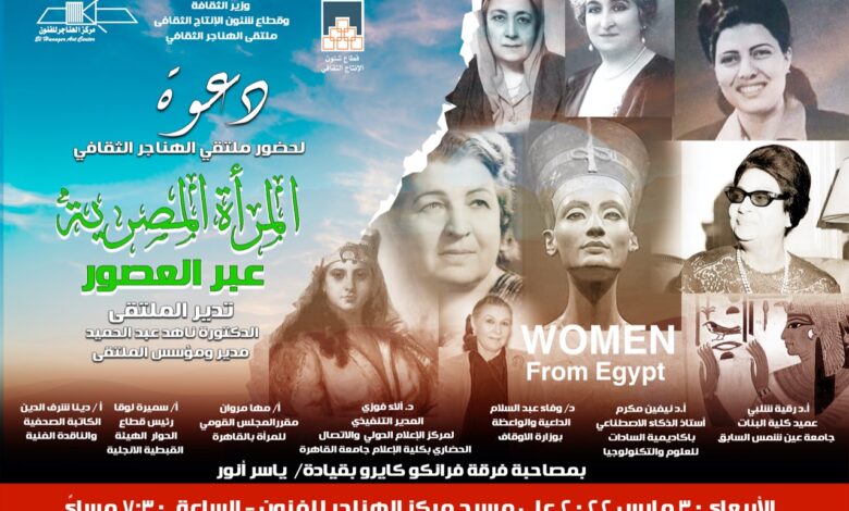 تحت رعاية الفنانة الدكتورة إيناس عبد الدايم وزيرة الثقافة، يطلق قطاع شئون الإنتاج الثقافي برئاسة المخرج خالد جلال، ملتقى الهناجر الثقافي الشهرى، بعنوان “المرأة المصرية عبر العصور”، فى السابعة من مساء غدا الأربعاء بمركز الهناجر للفنون، بحضور الفنان شادى سرور مدير عام المركز وكوكبة كبيرة من المثقفين والنقاد والفنانين ورجال الصحافة والإعلام .