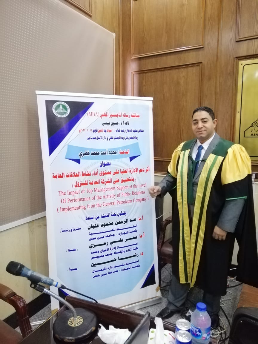 حصل الباحث محمد خضري عضو اللجنة النقابية بالشركة العامه للبترول على درجة الماجستير في إدارة الأعمال من جامعة عين شمس تحت عنوان أثر دعم الإدارة العليا على مستوى أداء نشاط العلاقات العامه وتكونت لجنة الحكم والمناقشة من الاستاذ الدكتور محمود عليان استاذ المحاسبة بكلية التجارة جامعة عين شمس مشرفا ورئيسا والأستاذ الدكتور عمر علي رمزي استاذ إدارة الأعمال وعميد كلية الادارة جامعة هليوبوليس عضو والدكتور رشا حسين استاذ إدارة الأعمال كلية التجارة جامعة عين شمس عضو ومنحت اللجنه الباحث درجة الماجستير في إدارة الأعمال