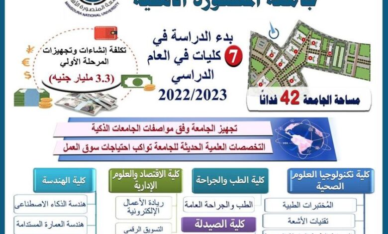 وأضاف المُتحدث الرسمي، أن جامعة المنصورة الأهلية تُقام على مساحة 42 فدانًا، ومقرها مدينة جمصة بمحافظة الدقهلية، وبتكلفة تقديرية بلغت في مرحلتها الأولى 3.3 مليارات جنيه، كما تم الانتهاء من أعمال المبانى الرئيسية، وكذلك الانتهاء من التشطيبات الداخلية.