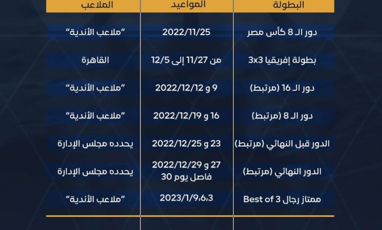 ومن المقرر ان يبدأ موسم كرة السلة بدور الـ 32 من بطولة كأس مصر يوم 16 شهر أكتوبر القادم ثم يتبعه انطلاق دوري المرتبط يوم 19 من الشهر نفسه ويقام الدور النهائي من البطولة أيام 27 و 29 من شهر ديسمبر.