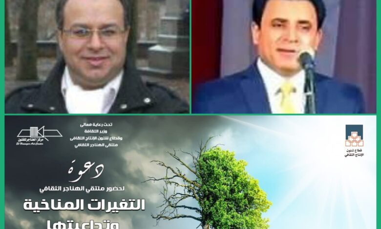 تحت رعاية الدكتورة نيفين الكيلانى وزيرة الثقافة، يقيم قطاع شئون الإنتاج الثقافى برئاسة المخرج خالد جلال، ملتقى الهناجر الثقافى بعنوان “التغيرات المناخية وتداعياتها”، فى السابعة والنصف من مساء يوم الاثنين ٢٩ أغسطس الجارى، بمركز الهناجر للفنون برئاسة الفنان شادى سرور.