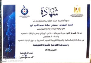 حصل المهندس حمدي أسامة المرشح كمعيد بكلية الهندسة جامعة عين شمس على المركز الأول في مجال الأطراف الصناعية والأجهزة التقويمية التي يتم التحكم بها عن طريق الإشارات العضلية وذلك تحت رعاية أ.د. محمود المتينى رئيس جامعة عين شمس و ا.د. عمر الحسيني عميد كلية الهندسة خلال المسابقة القومية للأجهزة التعويضية والتي تم تنظيمها خلال الفترة من ١/٩/٢٠٢١ الى ١٥/١١/٢٠٢١. وقد قام أ.د. خالد عبد الغفار وزير التعليم العالي والبحث العلمي بتسليم الجوائز للفائزين يوم الثلاثاء 8/2/2021 خلال الاحتفالية التى نظمتها أكاديمية البحث العلمى والتكنولوجيا بالتعاون مع القوات المسلحة . حيث شارك المهندس حمدي أسامة في المسابقة بمشروع تخرجه لسنة 2021 بالنيابة عن فريق العمل. وشارك في هذا المشروع فريق العمل من خريجين دفعة 2021 بكلية الهندسة جامعة عين شمس – قسم هندسة الميكاترونيات وهم: أحمد مجدي، أية عمرو، أميمة إبراهيم، بثينة توفيق، حمدي أسامة، سالم ماجد، عبدالرحمن أحمد، عبدالرحمن أكمل، يمنى عطية، و يوستينا القس و تم هذا المشروع تحت إشراف د/ محمد إبراهيم عوض الأستاذ المساعد بقسم هندسة الميكاترونيات.