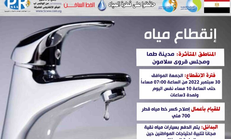 اليوم: قطع المياه عن مدينة طما ومجلس قروى سلامون بسوهاج من السابعة حتى العاشرة مساء لاصلاح خط مياه قطر 700 ملى