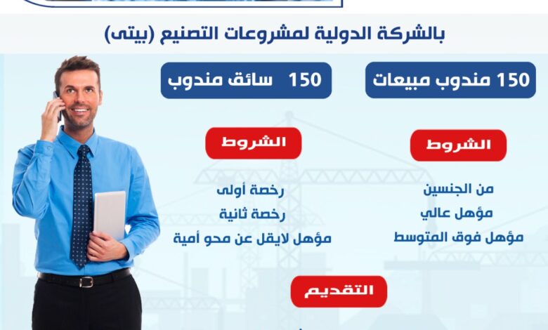 وزارة العمل: 300 فرصة عمل بالشركة الدولية لمشروعات التصنيع (بيتي)