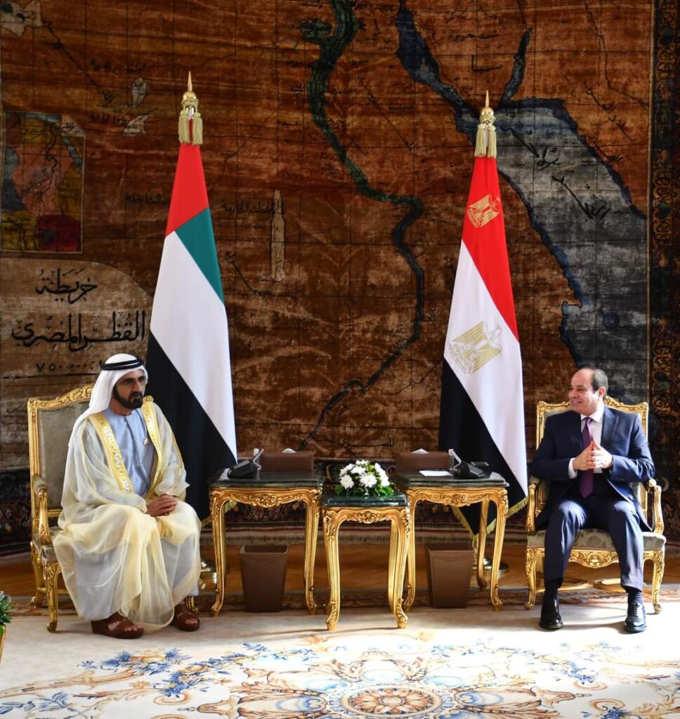 “استقبل السيد الرئيس عبد الفتاح السيسي اليوم صاحب السمو الشيخ محمد بن راشد آل مكتوم، نائب رئيس دولة الإمارات العربية المتحدة رئيس مجلس الوزراء حاكم إمارة دبي”.