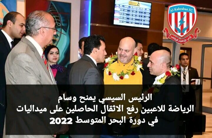 -يسعد مجلس ادارة نادى الكهرباء رئيس ونائب الرئيس والساده اعضاء مجلس الاداره والسيد المدير التنفيذى ومساعديه والساده اعضاء النادى… بعد قرار السيد الرئيس عبد الفتاح السيسي رئيس الجمهورية يمنح وسام الرياضة للاعبين رفع الاثقال الحاصلين على ميداليات في دورة البحر المتوسط 2022..
