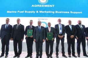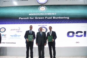 وشهد الوزير ، قيام اللجنة المشكلة بقرار السيد الدكتور رئيس مجلس الوزراء رقم 2772 لسنة 2018 “برئاسة وزارة البترول والثروة المعدنية وعضوية كل من (وزارة النقل – الهيئة العامة للمنطقة الاقتصادية لقناة السويس – وهيئة قناة السويس) والمعنية بمتابعة تنفيذ المنظومة المستحدثة لتموين السفن” باستصدار “تصريح مؤقت” لشركة OCI HyFuels حيث أبدت الشركة المذكورة رغبتها في الحصول على تراخيص للقيام بعمليات تموين السفن بالوقود الأخضر بالموانئ المصرية وذلك بعد نجاح تجربة تنفيذ أول عملية تموين بوقود الميثانول الأخضر بميناء شرق بورسعيد في أغسطس الماضي.