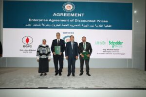 وقع الاتفاقية الجيولوجي علاء البطل الرئيس التنفيذي لهيئة البترول و المهندس خالد كامل مدير شركة شنايدر اليكتريك مصر بحضور المهندسة ايمان وافي مساعد رئيس هيئة البترول لتكنولوجيا المعلومات .