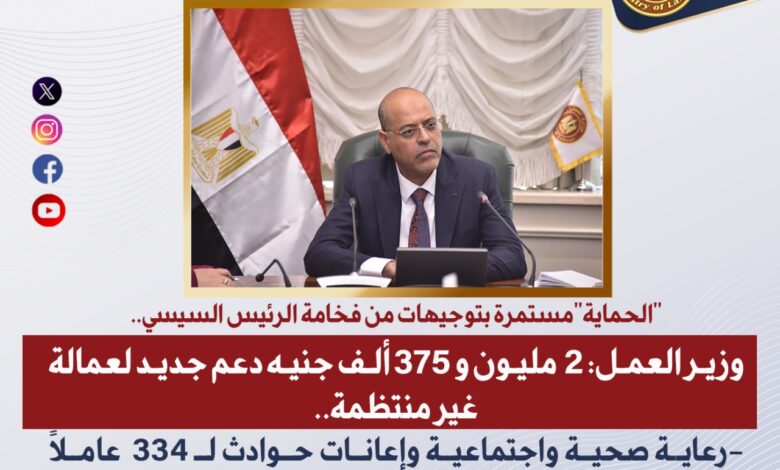 الحماية مستمرة بتوجيهات من فخامة الرئيس السيسي…وزير العمل: 2 مليون و 375 ألف جنيه دعم جديد لعمالة غير منتظمة