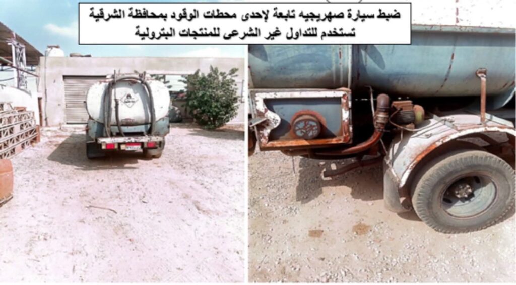 كما تم ضبط سيارة صهريجية حمولة 7000 لتر تابعة لمحطة وقود بمحافظة الشرقية تستخدم في التداول غير الشرعي للمنتجات البترولية .