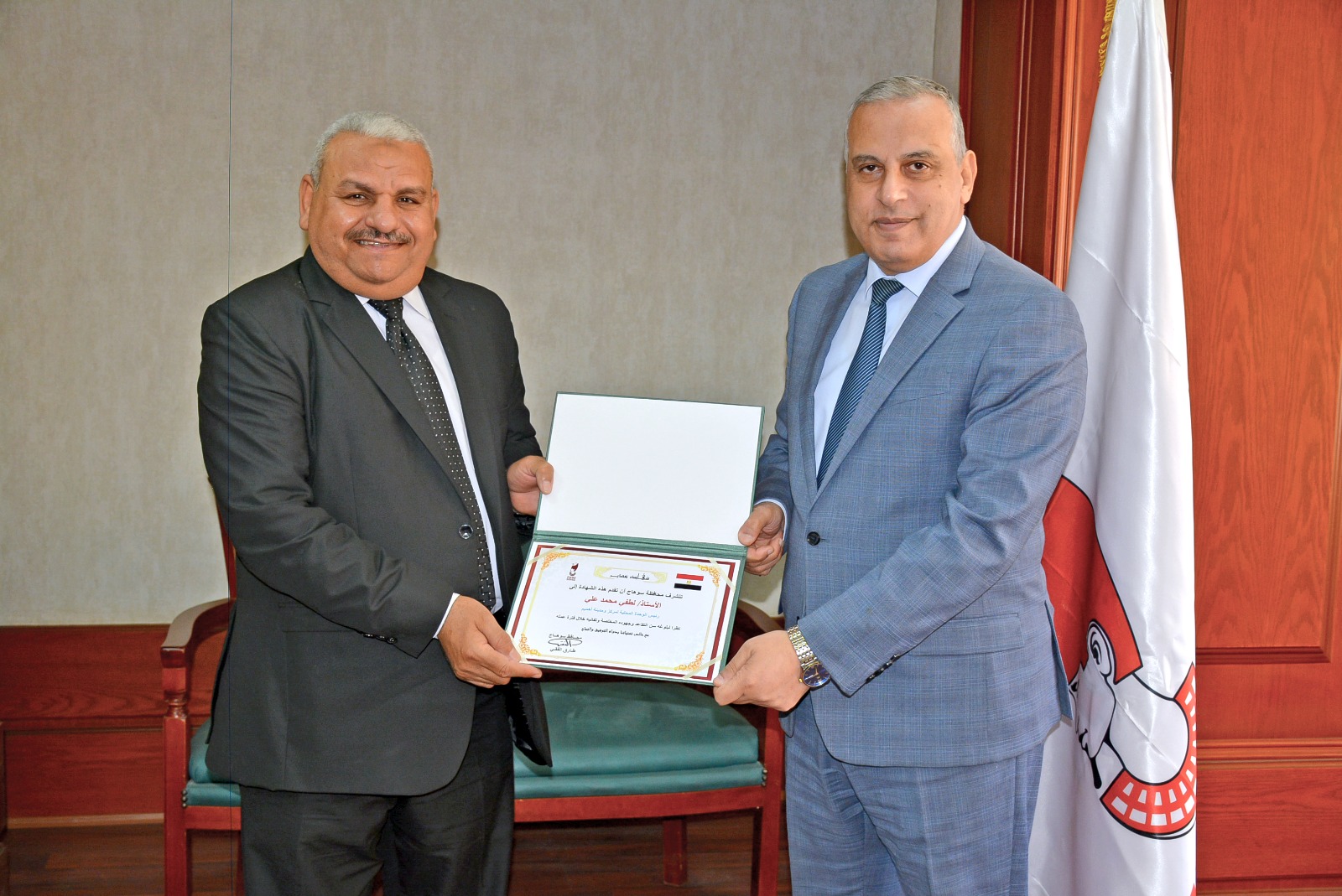 كرم اللواء طارق الفقي محافظ سوهاج، اليوم، ” لطفي محمد علي الشريف ” رئيس مركز ومدينة أخميم، بمناسبة بلوغه السن القانونية للتقاعد، بحضور السيد أحمد سامي القاضي نائب المحافظ.