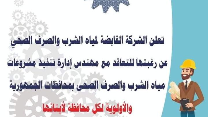 تعلن الشركة القابضة لمياه الشرب والصرف الصحي عن رغبتها للتعاقد مع مهندس إدارة تنفيذ مشروعات مياه الشرب والصرف الصحى بمحافظات الجمهورية والأولوية لكل محافظة لإبنائها.