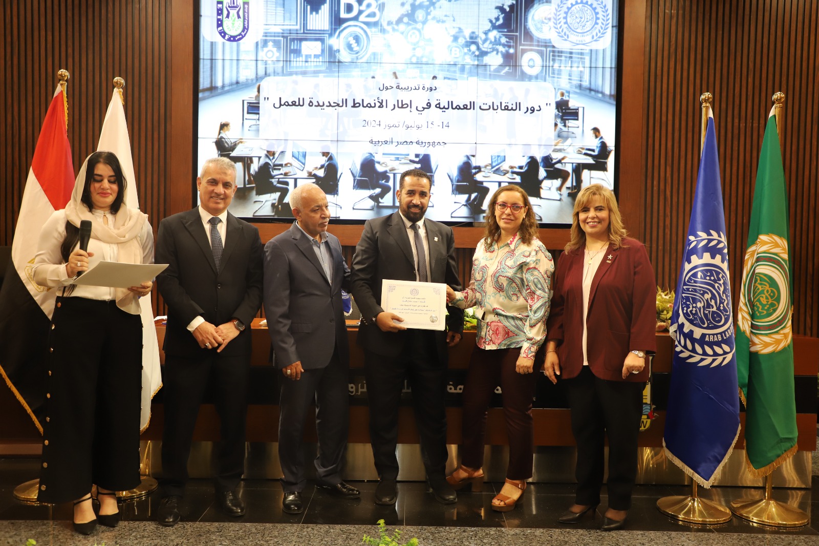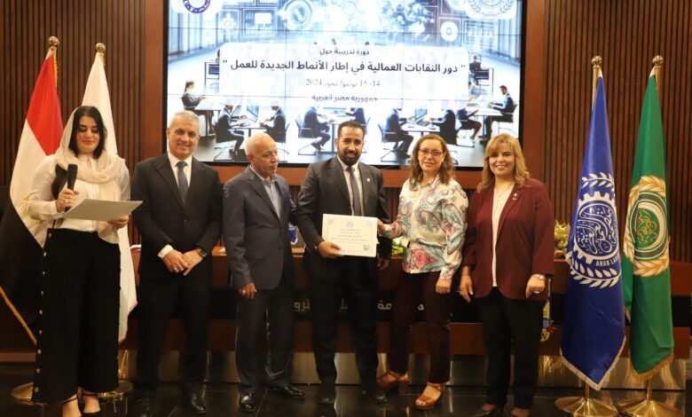 اختتمت منظمة العمل العربية اليوم، الدورة التدريبية، تحت عنوان” دور النقابات العمالية في إطار الأنماط الجديدة للعمل” والتي أطلقتها منظمة العمل العربية بالتعاون مع الإتحاد العام لنقابات عمال مصر وإستضفتها النقابة العامة للبترول برئاسة أحمد السروجي و بتنسيق من أمانة التثقيف و التدريب بالنقابة العامة للعاملين بالبترول برئاسة المحاسب / محمد صلاح السيد
