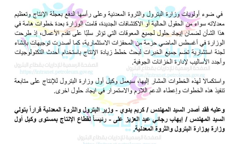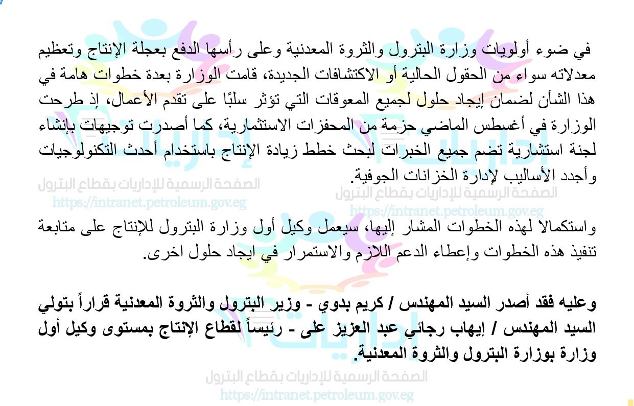 وعليه فقد أصدر السيد المهندس / كريم بدوي – وزير البترول والثروة المعدنية قراراً بتولي السيد المهندس / إيهاب رجائي عبد العزيز على – رئيساً لقطاع الإنتاج بمستوى وكيل أول وزارة بوزارة البترول والثروة المعدنية.