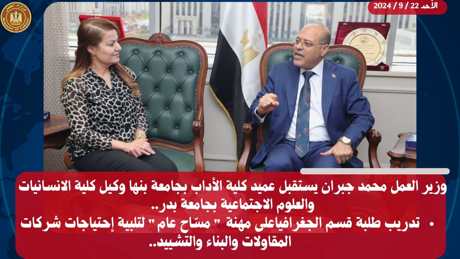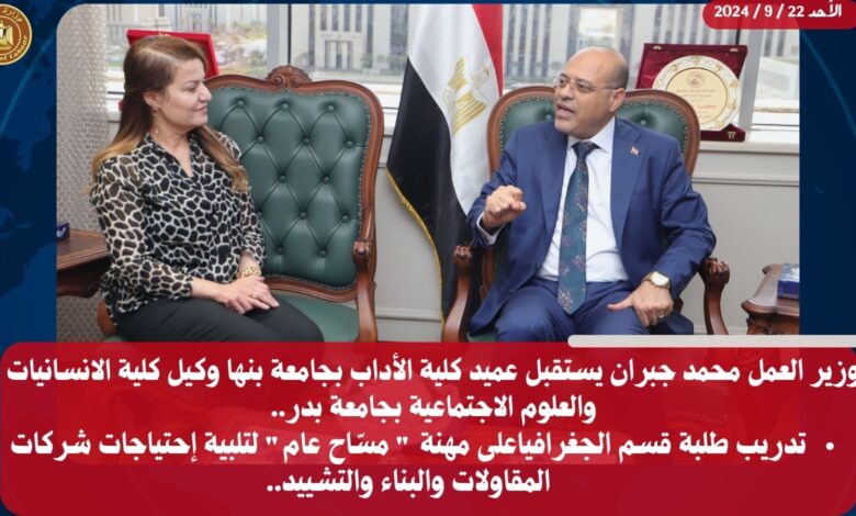 إستقبل السيد محمد جبران وزير العمل،اليوم الأحد ،بمكتبه بالعاصمة الإدارية الجديدة ،د.عبير الرباط عميد كلية الأداب بجامعة بنها ،وكيل كلية الانسانيات والعلوم الاجتماعية بجامعة بدر،لبحث سًبل التعاون في الملفات المُشتركة..وبحسب بيان صحفي ،إتفق الجانبان،على صياغة بروتوكول تعاون للإستفادة من إمكانيات “الوزارة”،في تدريب طلبة قسم الجغرافيا،على مهنة ” مسّاح عام “،لتلبية إحتياجات شركات المقاولات والبناء والتشييد،من هذه المهنة التي تختص، بإجراء القياسات وتحديد الحدود المناسبة،و تقديم البيانات والمعلومات اللازمة حول شكل الأراضي، ومحيطها، ومدى جاذبيتها، وموقعها، بالإضافة إلى تقييم الأراضي وتحديد أبعادها والتعرف على خصائصها.