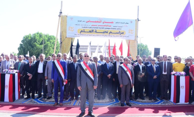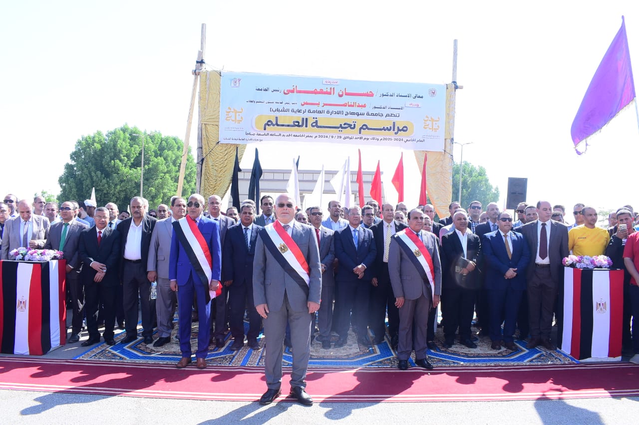 جامعة سوهاج تبدأ عامها الدراسي الجديد برفع العلم المصري وأداء تحية العلم على أنغام السلام الوطني تحت شعار “بداية”