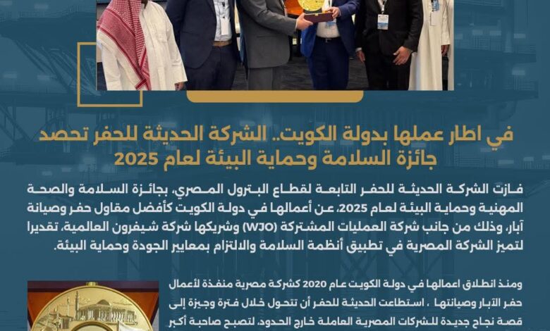 في اطار عملها بدولة الكويت.. الشركة الحديثة للحفر تحصد جائزة السلامة وحماية البيئة لعام 2025