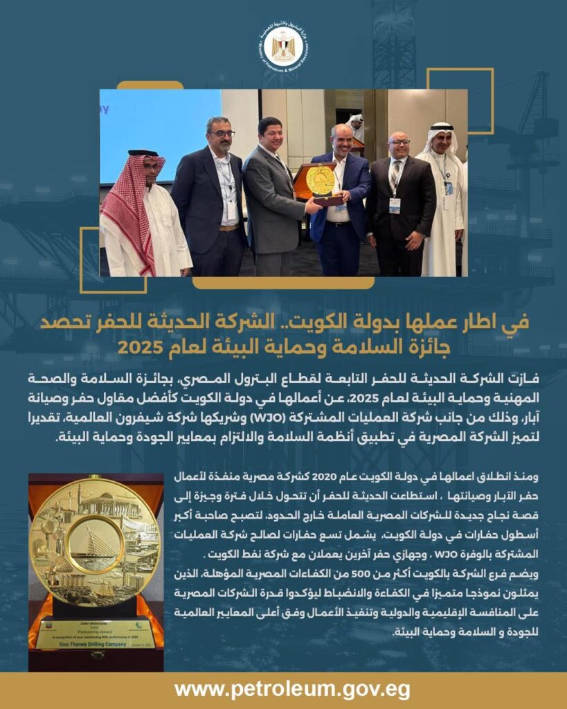 فازت الشركة الحديثة للحفر التابعة لقطاع البترول المصري ، بجائزة السلامة والصحة المهنية وحماية البيئة لعام 2025، عن أعمالها في دولة الكويت كأفضل مقاول حفر وصيانة آبار، وذلك من جانب شركة العمليات المشتركة (WJO) وشريكها شركة شيفرون العالمية، تقديرا لتميز الشركة المصرية في تطبيق أنظمة السلامة والالتزام بمعايير الجودة وحماية البيئة.