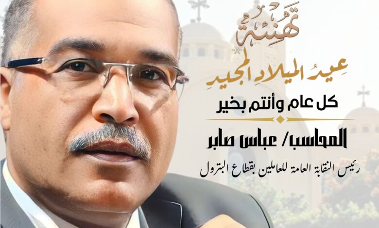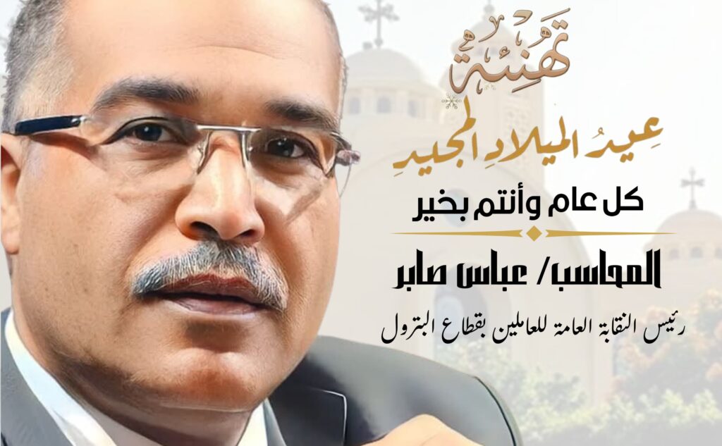 هنأ المحاسب عباس صابر رئيس المجلس التنفيذى للنقابة العامة للعاملين بالبترول ، جميع الاخوه الاقباط في مصر بمناسبه عيد الميلاد المجيد