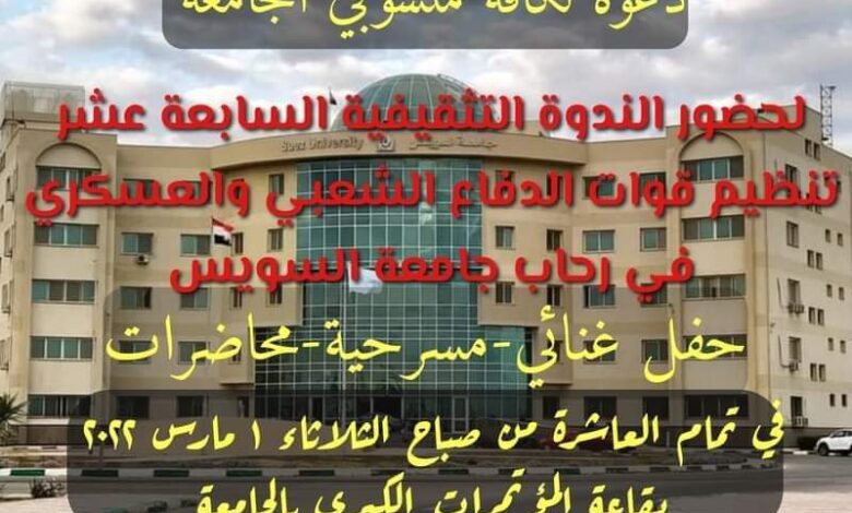 يدعو أ.د. السيد الشرقاوي رئيس جامعة السويس كافة منسوبي الجامعة من الطلاب والعاملين وأعضاء هيئة التدريس وقيادات الجامعة لحضور الندوة التثقيفية السابعة عشر لقوات الدفاع الشعبي والعسكري في رحاب جامعة السويس، في تمام العاشرة من صباح يوم الثلاثاء الأول من مارس ٢٠٢٢ بقاعة المؤتمرات الكبرى بالجامعة. حيث تشمل الندوة على فقرات فنية لحفل غنائي، عرض لمسرحية “حلم في عز الضهر” ومحاضرات تثقيفية وفقرات متنوعة . والحضور قبل الموعد بنصف ساعة بالكمامات الواقية .