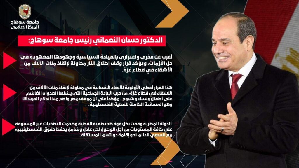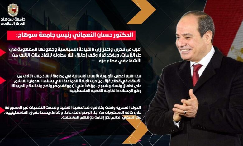 أعرب الدكتور حسان النعماني رئيس جامعة سوهاج عن فخره بالقيادة السياسية وجهودها المعهودة في حل الأزمات والقضايا الإقليمية والعربية المختلفة، لافتاً إلى ان الدولة المصرية وقفت بكل قوة ضد تصفية القضية وقدمت التضحيات غير المسبوقة علي كافة المستويات من أجل الوصول لحل عادل وشامل يحفظ حقوق الفلسطينيين، مع السعي الدائم نحو إقامة دولتهم المستقلة.