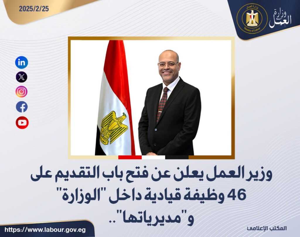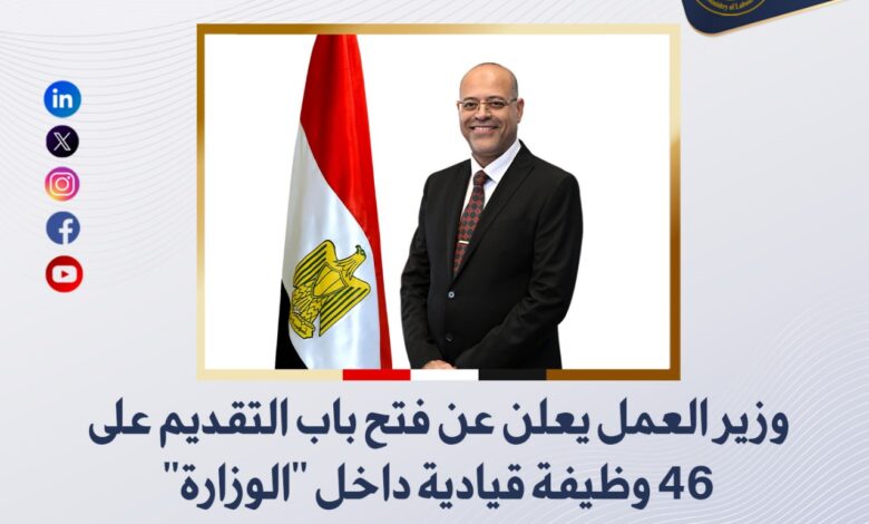 وزير العمل يعلن عن فتح باب التقديم على 46 وظيفة قيادية داخل الوزارة ومديرياتها