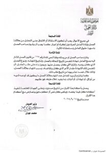 وأشارت المادة السادسة إلى أنه لا تسري أحكام اعتماد الاستقالة على حالات اتفاق طرفي علاقة العمل على انهاء عقد العمل بالتراضي والتوافق فيما بينهما سواء كان العقد محدد المدة او غير محدد المدة، ويتم تحرير اتفاق”تحلل أو تقايل” الطرفين من علاقة العمل، ويجب أن يتضمن الاتفاق ما يفيد حصول العامل على كافة مستحقاته المالية..أما المادة السابعة قالت أنه في جميع الأحوال يجب أن تكون الاستقالة أو الاتفاق على التحلل من علاقة العمل بإرادة العامل الحرة دون إكراه أو إجبار، كما يجب أن يقوم صاحب العمل بتسوية حقوق العامل ومستحقاته المالية..وجاء في المادة الثامنة أن يلتزم صاحب العمل أو من يمثله وفقاً لنص المادة رقم 175 من قانون العمل المشار اليه بمنح العامل شهادة تتضمن تاريخ التحاقه بالعمل، وتاريخ انتهائه، ونوع العمل الذي كان يؤديه، والمزايا التي كان يحصل عليها، ويجوز بناءً على طلب العامل، أن تتضمن تلك الشهادة مقدار الأجر الذي كان يتقاضاه، وسبب انتهاء علاقة العمل، وذلك خلال خمسة عشر يوماً من تاريخ طلب ذلك،كما يلتزم بأن يرد للعامل عند انتهاء علاقة العمل ما يكون قد أودعه لديه من أوراق، أو شهادات، أو أدوات، وما يفيد إخلاء طرفه، فور طلبهم..والمادة التاسعة جاء فيها أنه يُعمل بأحكام هذا القرار من تاريخ صدوره،في 14 -9-2025،وعلى الجهات المختصة تنفيذ أحكامه كل فيما يخصه، ويلغى كل نص أو حكم سابق يتعارض مع أحكام هذا القرار..