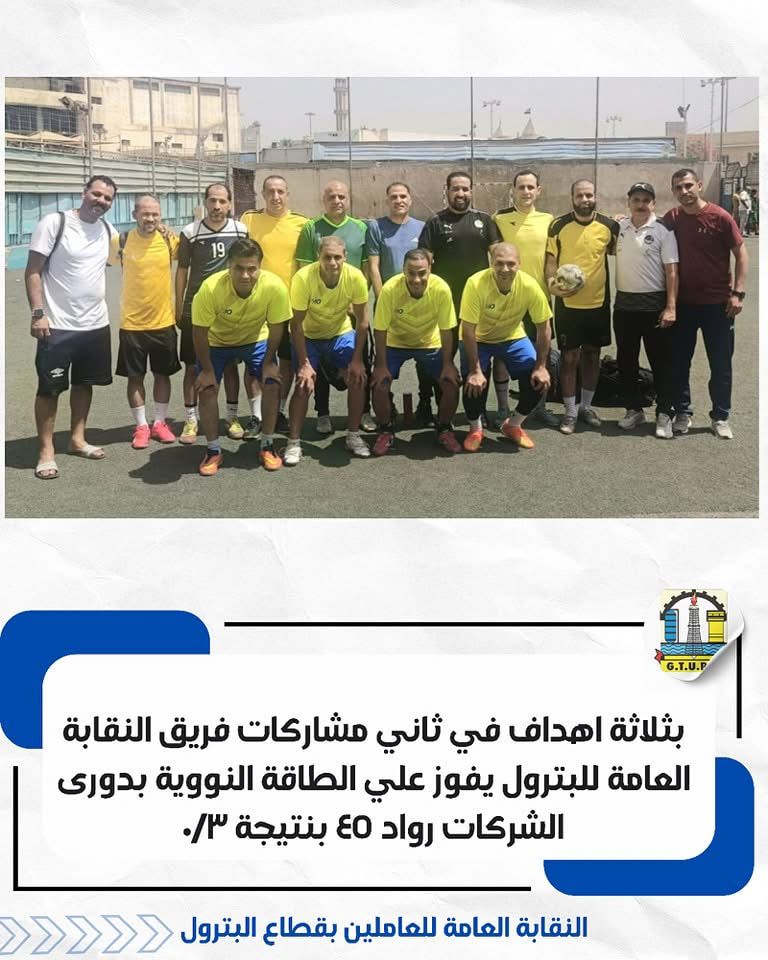 نجح فريق النقابة العامة للبترول “رواد ٤٥ ” فى تحقيق الفوز على الطاقة النووية بنتيجة ٣/ ٠ بدورى الشركات