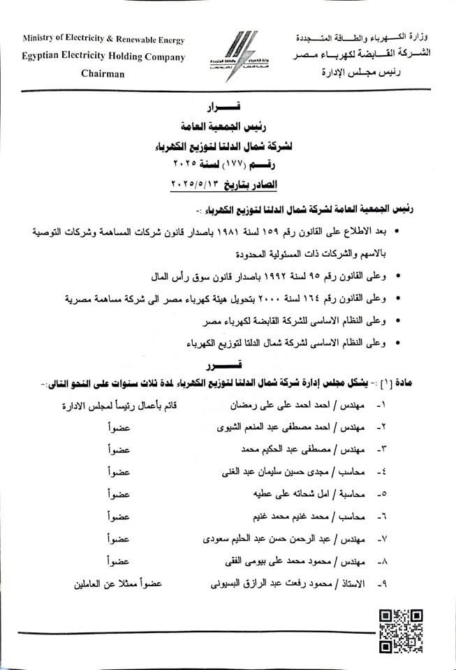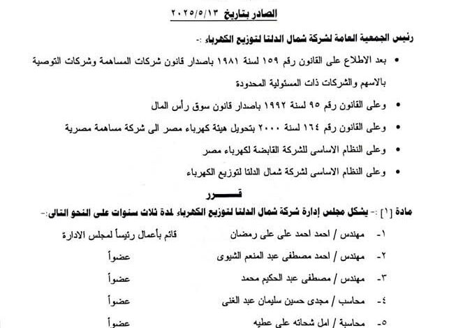 تشكيل مجلس إدارة شركة شمال الدلتا لتوزيع الكهرباء برئاسة المهندس أحمد رمضان