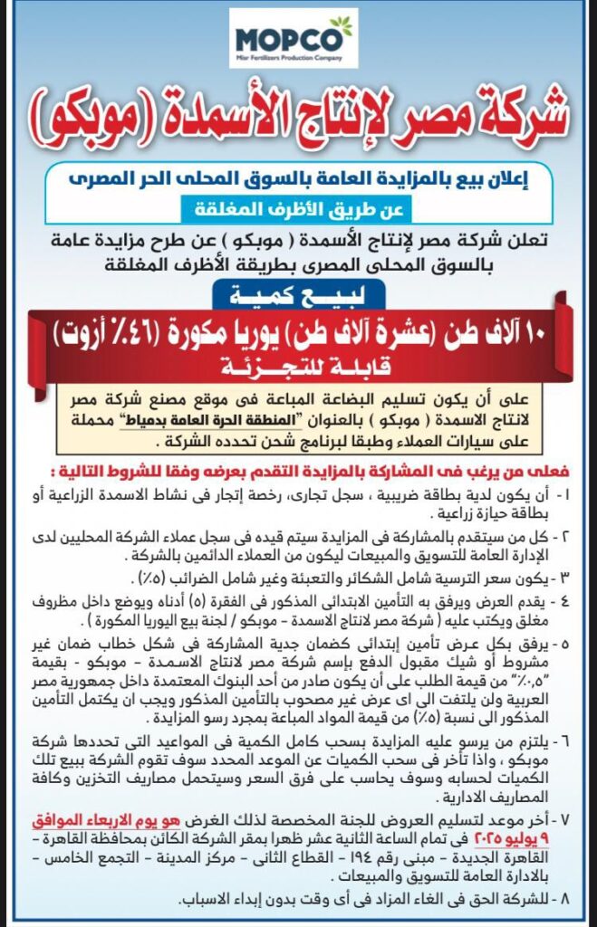 أعلنت شركة مصر لإنتاج الأسمدة (موبكو) عن طرح مزايدة عامة للبيع بالسوق المحلي المصري لعدد 10 آلاف طن من سماد اليوريا المكورة (46% أزوت)، قابلة للتجزئة، وذلك بنظام الأظرف المغلقة.