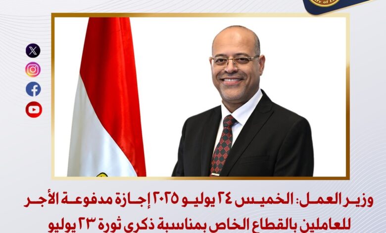 وزير العمل: الخميس 24 يوليو 2025 إجازة مدفوعة الأجر للعاملين بالقطاع الخاص بمناسبة ذكرى ثورة 23 يوليو