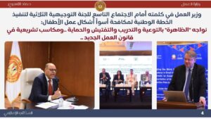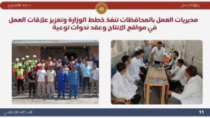 نشرت وزارة العمل اليوم الجمعة “انفوجراف”، يوضح حصاد “الوزارة” خلال الـ7 أيام الماضية …في هذا الأسبوع شارك معالي وزير العمل محمد جبران في جولة داخل مصانع شركة النصر للسيارات …حيث قام الفريق مهندس/ كامل الوزير نائب رئيس مجلس الوزراء للتنمية الصناعية وزير الصناعة والنقل، يرافقه المهندس/ محمد شيمي، وزير قطاع الأعمال العام والسيد/ محمد جبران، وزير العمل والدكتور/ أسامة الأزهري وزير الأوقاف، بجولة تفقدية بمصانع شركة النصر لصناعة السيارات بحلوان، التابعة للشركة القابضة للصناعات المعدنية، إحدى شركات وزارة قطاع الأعمال العام..وعلى هامش الجولة تم تنظيم ندوة تثقيفية تحدث فيها السادة الوزراء عن التطور الذي تشهده الشركة ، وخطة الحكومة لإحياء الصناعات الوطنية الاستراتيجية.. وقال وزير العمل أن بيئة العمل اللائقة أساس الاستثمار.،وأن قانون العمل الجديد يراعي معايير العمل الدولية ويحقق الأمان الوظيفي للعمال..كما التقى الوزير جبران مع وفدِ من شركة ماجنت بلتون للحلول الإدارية، وهي شركة استشارات مصرية رائدة في التحول المؤسسي وتطوير الموارد البشرية،كما أنها الذراع التنفيذي لمجموعة بلتون القابضة،تقدم خدمات تشمل: بناء الهياكل،و تطوير الأداء،و التوظيف، والتدريب، وربط الشركات بالمعايير المؤسسية الحديثة..واستقبل الوزير جبران ، السفير ياسر هاشم، قنصل جمهورية مصر العربية الذي سوف يتسلم مهامه الجديدة في الرياض بالمملكة العربية السعودية ، مطلع الشهر المُقبل،للتنسيق في كافة الملفات المشتركة ..كما افتتح معالي وزير العمل ،بمقر “الوزارة ” في العاصمة الإدارية الجديدة ندوة توعوية بمواد قانون العمل الجديد رقم 14 لسنة 2025 ، وذلك في إطار التوسع في “التشاور الاجتماعي”،وإستعراض الإستعدادات الجارية للإنتهاء من اللائحة التنفيذية للقانون المُقرر تطبيقه مطلع الشهر المُقبل ..هذا وقد شاركت وزارة العمل في أعمال الاجتماع التاسع للجنة التوجيهية الثلاثية لتنفيذ الخطة الوطنية لمكافحة أسوأ أشكال عمل الأطفال في مصر ودعم الأسرة “2018 – 2025، والمنعقد في القاهرة ، وتحدث فيها السيد/ إيريك أوشلان، مدير مكتب منظمة العمل الدولية بالقاهرة-، والمهندسة/ مارجريت صاروفيم – نائبة وزيرة التضامن الاجتماعي، و الدكتورة سحر السنباطي، رئيسة المجلس القومي للطفولة والأمومة، والسيد عبدالمنعم الجمل رئيس الإتحاد العام لنقابات عمال مصر.. وألقت رشا عبدالباسط رئيس الإدارة المركزية للعلاقات الدولية كلمة نيابة عن وزير العمل ،الذي أكد على أن الحكومة تواجه “الظاهرة” بالتوعية والتدريب والتفتيش والحماية، موضحا المكاسب التشريعية في قانون العمل الجديد ..كما أصدرت وزارة العمل نشرة التوظيف نصف الشهرية ، التي تُعلن فيها عن فرص عمل جديدة في المحافظات ، تنسيقًا مع شركات القطاع الخاص..وقالت في بيان أنها تلقت، طلبات جديدة من 48 شركة قطاع خاص في 12محافظة لديها 4374 وظيفة مٌتوفرة الآن، في عددِ من التخصصات، منها لأصحاب القُدرات الخاصة “ذوي الهمم”، وذلك برواتب مجزية تحدد حسب المقابلة ،وفقاً للحد الأدنى للأجور ،فضلاً عن التأمين الصحي والاجتماعى..هذا وقد قرر وزير العمل ، تحويل 2 من مفتشي العمل إلى النيابة العامة للتحقيق معهم ، وايقافهما 3 أشهر عن العمل لحين صدور “قرار النيابة” ،وذلك لاتهامهما بتقاضي رشوة من إحدى شركات الحاق العمالة بالخارج، وأكد الوزير جبران في تصريحات صحفية، أنه لا تستر على الفساد،وأنه لا مكان للمخالفين داخل الوزارة…تنفيذاً لتوجيهات وزير العمل، برعاية وحماية العمالة المصرية بالخارج ، وبعد متابعة ماتم تداوله على مواقع التواصل الاجتماعي بشأن عدم تقنين أوضاع 26 عامل مصرى بإيطاليا و المتضررين من عدم قيام صاحب العمل”مصرى الجنسية”، استكمال إجراءات إقامتهم وعقود عملهم ، فقد قام الملحق العمالي بإيطاليا السيد سعيد حجازي ،بعقد اجتماع عاجل مع الأطراف المعنية لبحث سبل وآليات حل تلك المشكلة من خلال الآليات ا