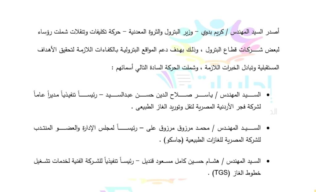 أصدر المهندس كريم بدوي، وزير البترول والثروة المعدنية، حركة تكليفات وتنقلات جديدة داخل قطاع البترول، استهدفت عدداً من المواقع القيادية بشركات الغاز، وذلك في إطار سياسة الوزارة لدعم المواقع البترولية بالكفاءات اللازمة لتحقيق الأهداف المستقبلية وتبادل الخبرات.