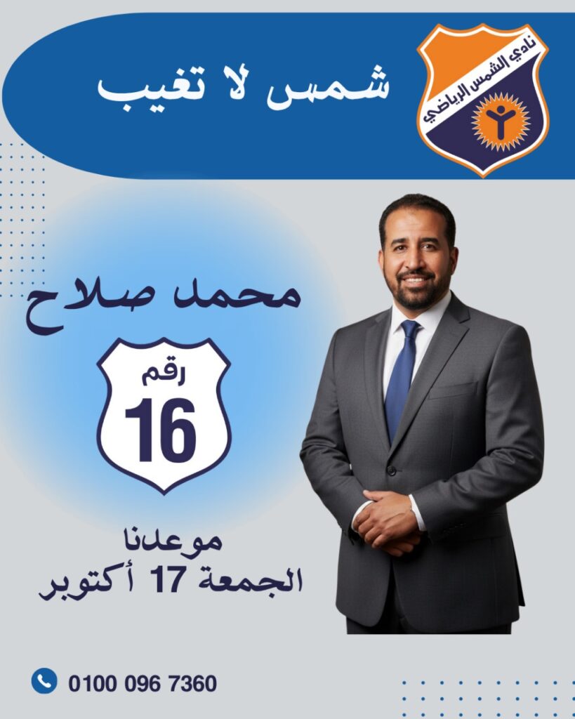 صرّح المتحدث الرسمي بإسم الحملة الانتخابية للمرشح بانتخابات نادي الشمس الرياضي، على عضوية مجلس الإدارة، محمد صلاح أمين الشباب وعضو المكتب التنفيذي بالنقابة العامة للبترول، رقم (16) بقائمة المرشحين على عضوية مجلس الإدارة في الانتخابات، المقرر عقدها يوم 17 أكتوبر الجاري، أن السبب الرئيسي الذي دفع المرشح محمد صلاح لعضوية مجلس إدارة نادي الشمس نابعة من إيمانه العميق بأهمية إستعادة الريادة لهذا النادي العريق ومكانته ورنقه، باعتباره أكبر الأندية على مستوى الشرق الأوسط والعالم من حيث المساحة والتوسعات والإنشاءات والخدمات وعدد المشاركين، والتوسع في الخدمات الرياضية والاجتماعية، تنال الرضا الكامل من جميع أعضاء النادي، وإيمانًا منا بأن رسالة الأندية العريقة لا تُختزل في الرياضة وحدها، بل تمتد لتكون ساحات لبناء الإنسان ومراكز لصناعة الثقافة ومنابر لدعم المجتمع وركائز للتنمية والاستثمار.