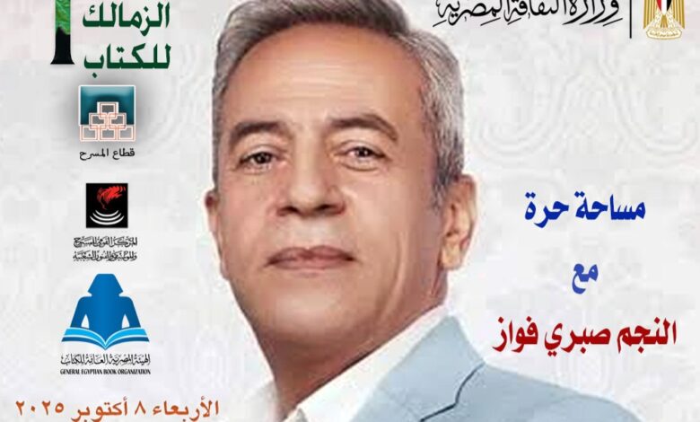 برعاية الدكتور أحمد فؤاد هنو وزير الثقافة؛ وضمن فعاليات معرض الزمالك الأول للكتاب الذي ينظمه المركز القومي للمسرح والموسيقى والفنون الشعبية، بالتعاون مع الهيئة المصرية العامة للكتاب، وتحت عنوان (مساحة حرة) يتحدث الفنان القدير صبري فواز؛ الساعة السادسة مساء غدا الأربعاء ٨ أكتوبر ٢٠٢٥م؛ في لقاء مفتوح، وذلك بمقر المركز القومي للمسرح والموسيقى والفنون الشعبية الكائن ب٩ش حسن صبري بالزمالك.
