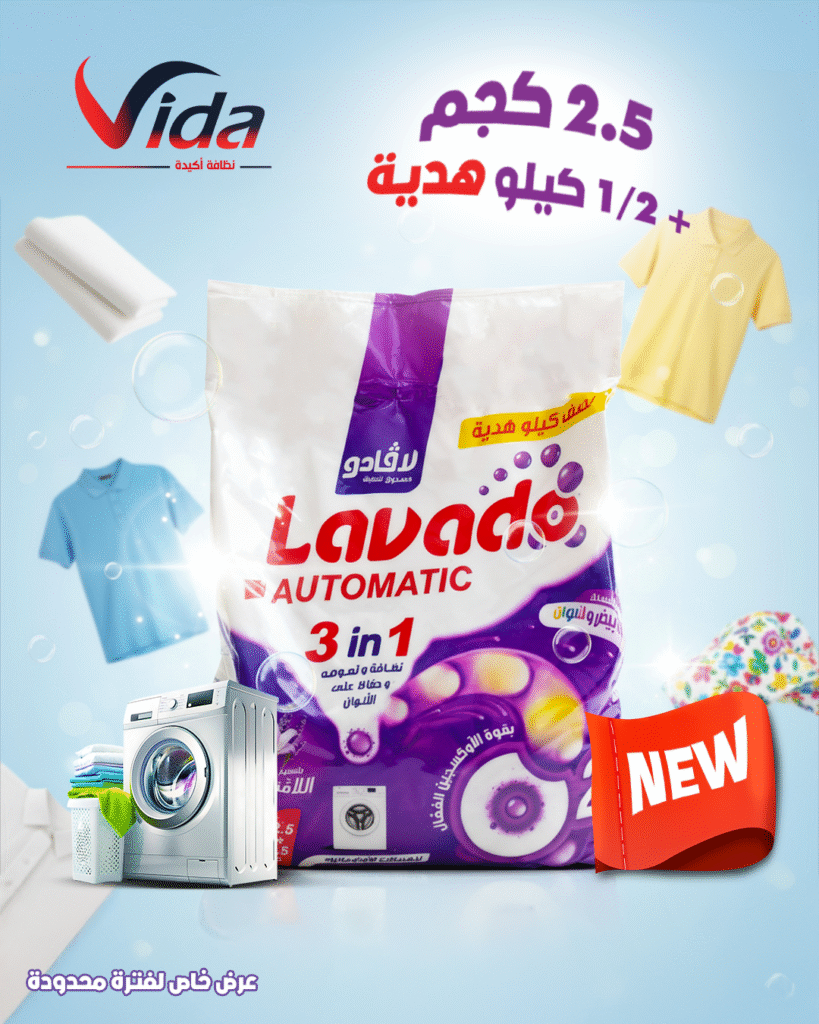 ويُعد «LAVADO» مسحوق غسيل مخصص للغسالات الأوتوماتيك، يأتي في عبوة ٢.٥ كجم + نصف كيلو هدية، ليقدم أداءً متميزًا في النظافة ولمعانًا يدوم طويلاً، بجودة تضاهي كبرى الماركات العالمية، وبسعر مفاجأة يناسب كل بيت مصري.