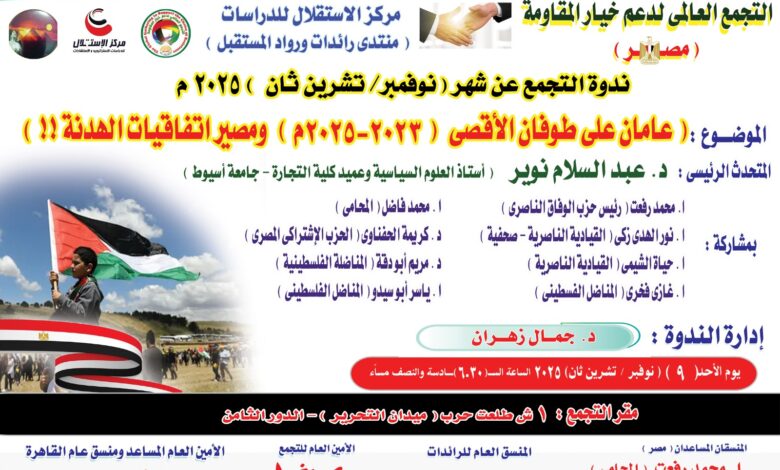 عامان على طوفان الاقصى وما مصير اتفاقيات الهدنه هذا العنوان يتصدر ندوة التجمع العالمي لدعم خيار المقاومه مصر بالاشتراك مع مركز الاستقلال للدراسات ومنتدى رائدات ورواد المستقبل حيث يعقد التجمع ندوته الاحد القادم 9 نوفمبر بمقره بميدان التحرير
