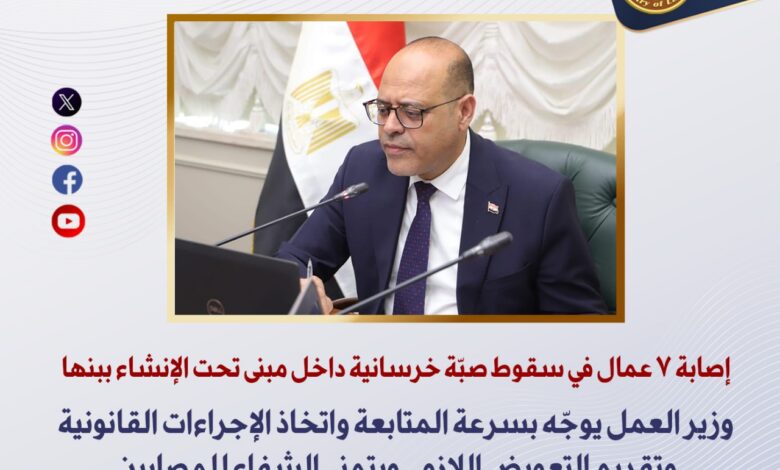إصابة 7 عمال في سقوط صبّة خرسانية داخل مبنى تحت الإنشاء ببنها…. وزير العمل يوجّه بسرعة المتابعة واتخاذ الإجراءات القانونية وتقديم التعويض اللازم.. ويتمنى الشفاء للمصابين