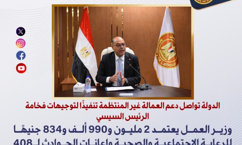 الدولة تواصل دعم العمالة غير المنتظمة تنفيذًا لتوجيهات فخامة الرئيس السيسي… وزير العمل يعتمد 2 مليون و990 ألف و834 جنيهًا للرعاية الاجتماعية والصحية وإعانات الحوادث لـ408 عمال في 25 محافظة